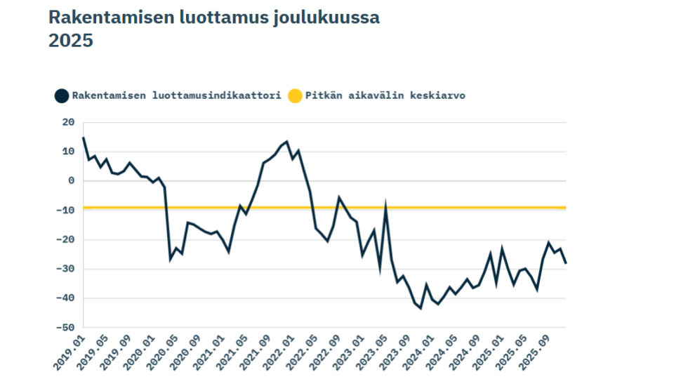 Rakentamisen luottamus pysyi joulukuussa matalalla tasolla. Luottamusindikaattorin tuorein lukema on -28, kun se oli marraskuussa -23 pisteessä. Luottamus on selvästi heikompaa kuin pitkän aikavälin keskiarvo (-9).