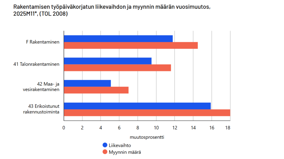 Erikoistuneen rakennustoiminnan liikevaihto kasvoi vuoden 2025 marraskuussa 15,9 % ja myynnin määrä 18,0 % vuodentakaisesta. Talonrakentamisen työpäiväkorjattu liikevaihto kasvoi 9,5 % ja myynnin määrä 11,6 %. Maa- ja vesirakentamisen liikevaihto kasvoi 5,1 % ja myynnin määrä 7,0 %.