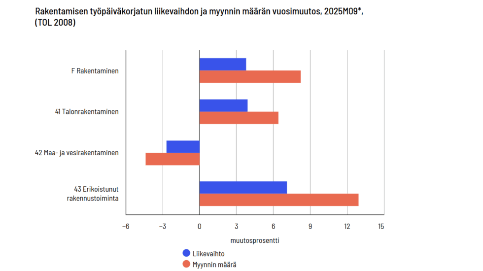 Rakennusyritysten työpäiväkorjattu liikevaihto kasvoi vuoden 2025 syyskuussa 3,8 % vuodentakaiseen verrattuna. Myynnin määrä, josta hintojen muutosten vaikutus on poistettu, kasvoi 8,2 %.