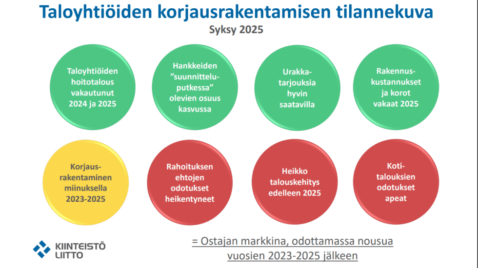 Taloyhtiöiden korjausrakentamisen määrä jäänee jälkeen vuonna 2025 edellisvuosista. Näkymät eivät kuitenkaan enää heikentyneet kevääseen 2025 verrattuna. Barometrissa laskettava vastausvuoden Ilmapuntarin saldolukema oli edelleen miinusmerkkinen, mutta miinus oli kevään 2025 lukemaa pienempi. Pääkaupunkiseudulla ja Pohjois-Suomessa saldoluvut olivat parhaat. Koko Suomessa aiempaa suuremmasta korjaamisen määrästä raportoi 26 % vastaajista, kun taas pienemmästä määrästä kertoi 30 % vastaajista.