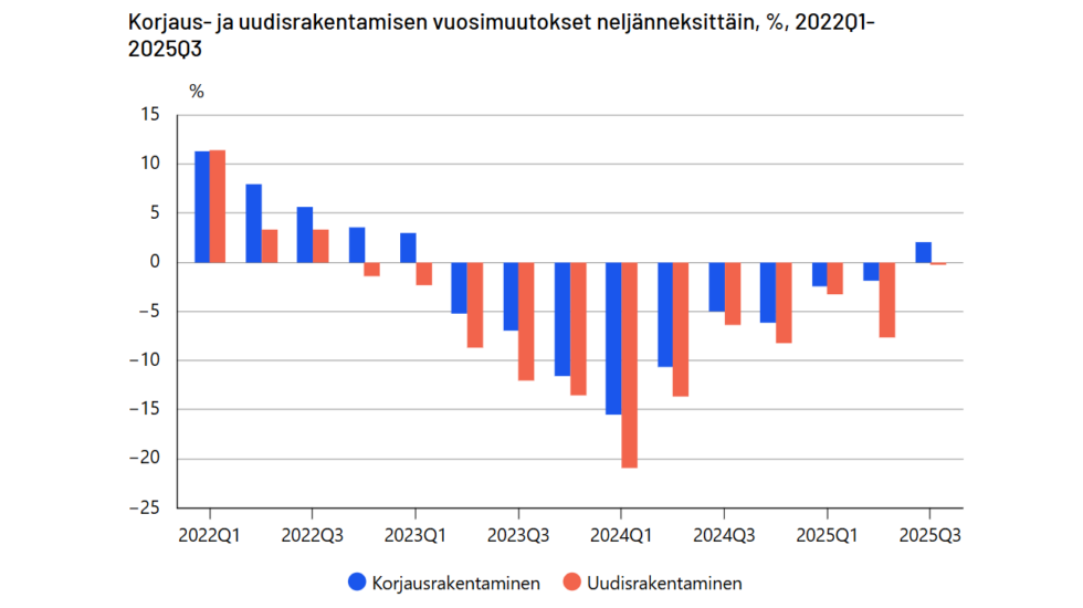Vuoden 2025 kolmannella neljänneksellä suhdannekehitys oli korjausrakentamisessa vahvempaa kuin uudisrakentamisessa. Uudisrakentamisen arvo laski 0,3 % verrattuna vuoden takaiseen, ja korjausrakentamisen arvo kääntyi nousuun pitkän laskun jälkeen.