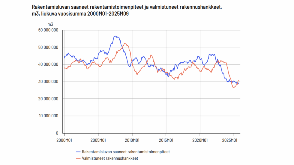 Uudisrakentamiseen rakentamisluvan saaneiden rakentamistoimenpiteiden kuutiomäärän vuosisumma väheni 4 % vuoden takaisesta syyskuussa 2025. Rakentamislupia myönnettiin 29 miljoonalle kuutiometrille lokakuun 2024 ja syyskuun 2025 välisenä aikana. Rakennushankkeita valmistui ajanjaksolla 31 miljoonaa kuutiometriä, mikä oli 8 % vuoden takaista enemmän.
