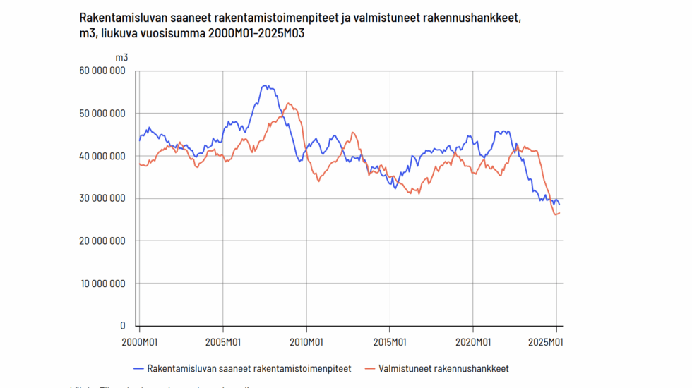 Uudisrakentamiseen rakentamisluvan saaneiden rakentamistoimenpiteiden kuutiomäärän vuosisumma väheni 3 % vuoden takaisesta maaliskuussa 2025. Rakentamislupia myönnettiin 29 miljoonalle kuutiometrille huhtikuun 2024 ja maaliskuun 2025 välisellä ajalla. Rakennushankkeita valmistui ajanjaksolla 27 miljoonaa kuutiometriä, mikä oli 26 % vuoden takaista vähemmän.