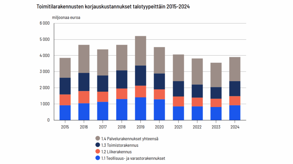 Teollisuus- ja varastorakennuksia korjattiin 0,9 miljardilla eurolla vuonna 2024. Liike- ja toimistorakennuksia korjattiin 1,5 miljardilla eurolla ja palvelurakennuksia myös 1,5 miljardilla eurolla.